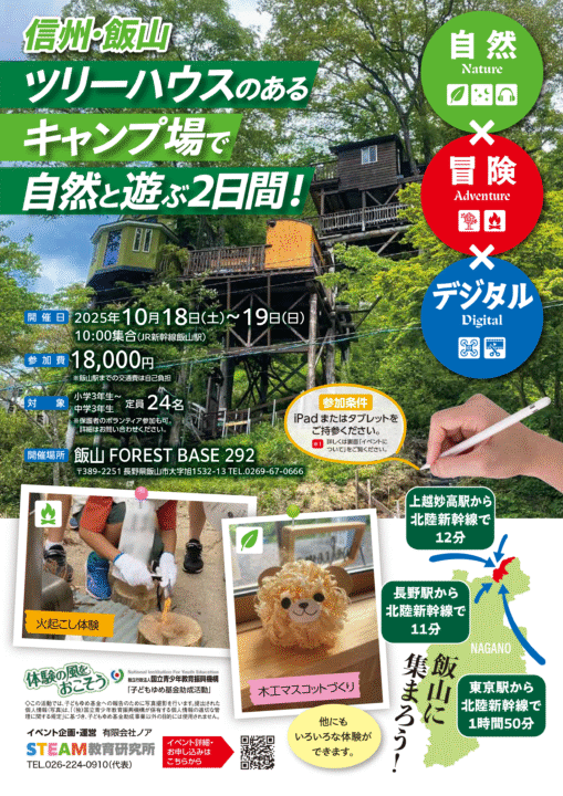 今回の自然体験では、360°大自然に囲まれた信州・飯山の地で、さまざまなアクティビティを楽しみながら、かつ、できる限り自分たちの力で課題をクリアしていく中で、たくさんのワクワクと発見を、デジタルテクノロジーを介してより深い学びにつなげていく内容になっています。