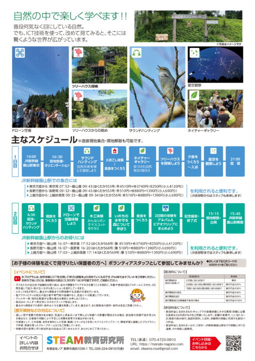 2日目:15:15FOREST BASE出発、15:35JR新幹線飯山駅着・解散予定(15:15直接現地解散可)