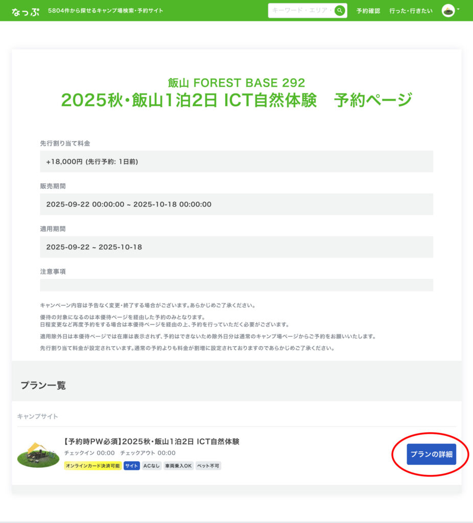予約ページの表紙が表示されるので、『プランの詳細』をクリックします